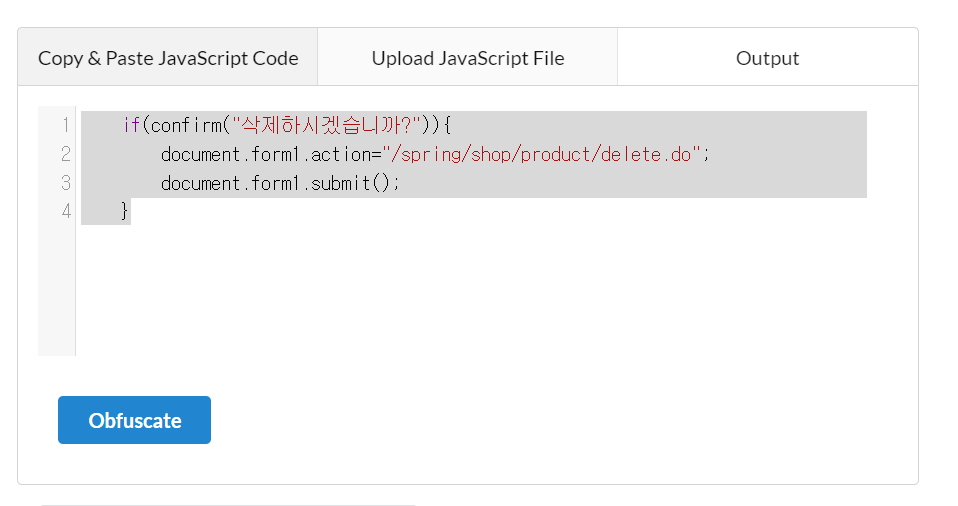 위에 나열된 난독화된 사이트 중 하나로 이동하여 코드를 업로드합니다. 난독화 버튼을 클릭 산출여기에 난독화된 코드가 있습니다.