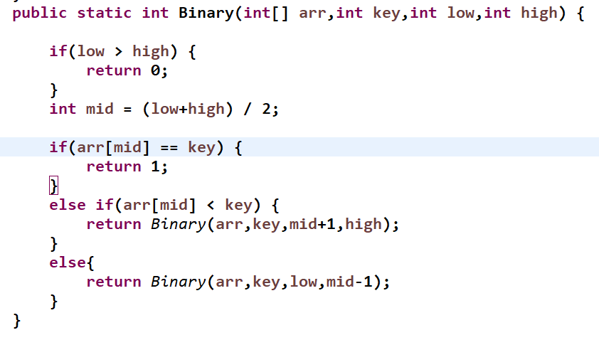이 코드를 통해 low와 high의 위치가 뒤바뀌었다면 찾을 요소 값이 없다는 의미이므로 0이 리턴된다.