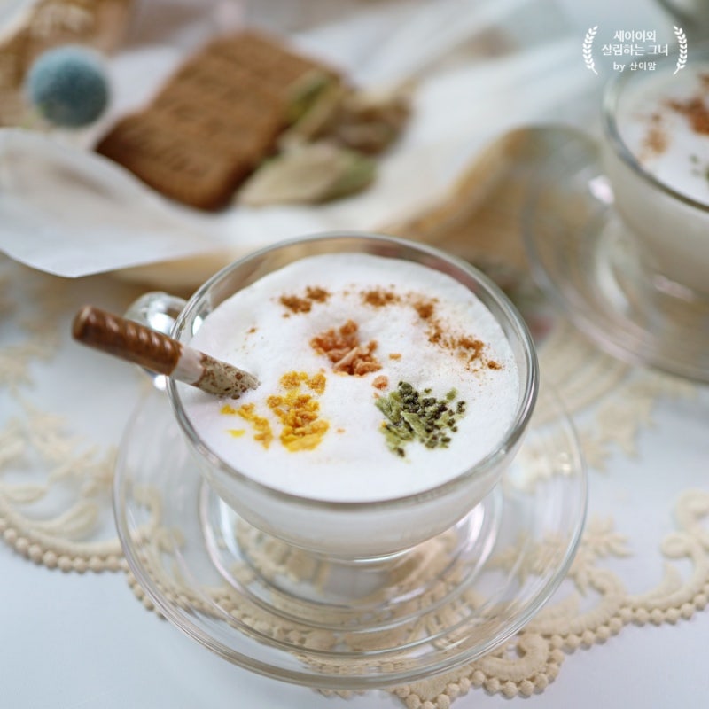 (생강라떼 만들기 재료) 1인당 우유 200g 생강청 150g 계피가루 1작은술 브랜드 제품은 설탕을 넣지 않고 차로 마실 수 있어 별도의 설탕은 필요하지 않습니다. 생강차를 뜨거울 때까지 데운 후 우유 거품을 데우기만 하면 생강라떼 재료가 준비된다. 홈카페 레시피지만 거품기만 있으면 만들 수 있고 모양도 맛도 잘 즐길 수 있다. 부드러운 우유 거품은 짭짤한 맛이 있습니다. 카페 분위기를 위해 뜨거운 생강 시럽에 부어주세요! (생강즙 발색) ● 찬 음료 ● 따뜻한 차 ● 밀크티 ● 토핑 ● 푸드 베이스 건강 음료로도 꽤 만족스러운데 샐러드 드레싱이나 요리 소스에 곁들일 수 있어 재구매합니다. 시나몬 가루를 넣으면 속이 빈 생강차가 한 단계 더 올라가고, 하얀 거품이 겨울 눈내림에 제격… 아직 거품을 조정할 시간이 없었고 몇 번 시도하고 실패했습니다. . . .헤헤헤… 입에서 살살 녹는 건강 음료, 진저라떼! 몸을 따뜻하게 하는 성분이 들어 있어 겨울에 먹기 좋다. 드디어 오늘부터 본격적으로 식탁을 차리고 설거지를 할 시간입니다.